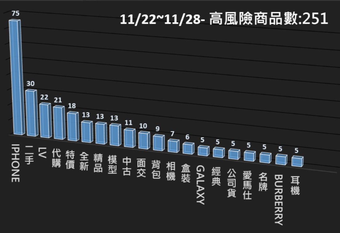本署電商防詐雷達本週(11/22~11/28)共掃瞄21,128筆電商平台商品,發現其中251筆為高風險商品,並已提供相關資訊給電商平台進行預防性下架,以降低消費者接觸詐騙商品的風險。