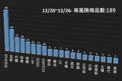 本署電商防詐雷達本週(12/27~1/2)共掃瞄39,977筆電商平台商品,發現其中462筆為高風險商品,並已提供相關資訊給電商平台進行預防性下架,以降低消費者接觸詐騙商品的風險。