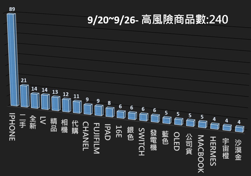 本署電商防詐雷達本週(9/20~9/26)共掃瞄22,355筆電商平台商品,發現其中240筆為高風險商品,並已提供相關資訊給電商平台進行預防性下架,以降低消費者接觸詐騙商品的風險。