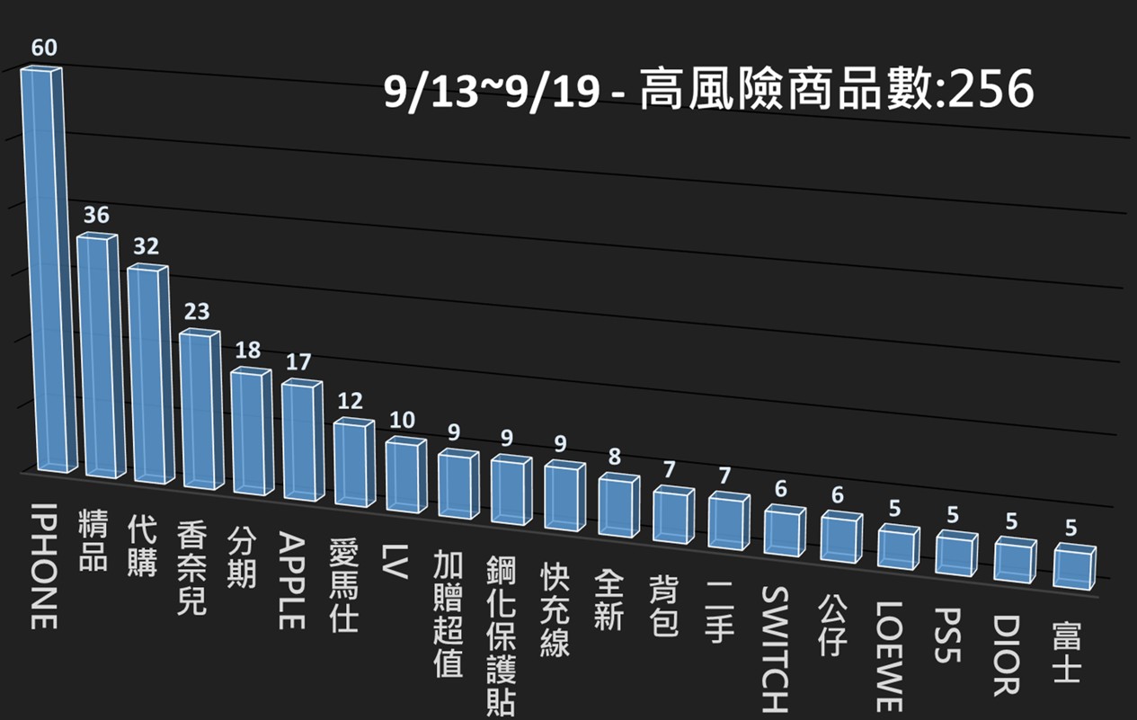 本署電商防詐雷達本週(9/13~9/19)共掃瞄22,049筆電商平台商品,發現其中256筆為高風險商品,並已提供相關資訊給電商平台進行預防性下架,以降低消費者接觸詐騙商品的風險。