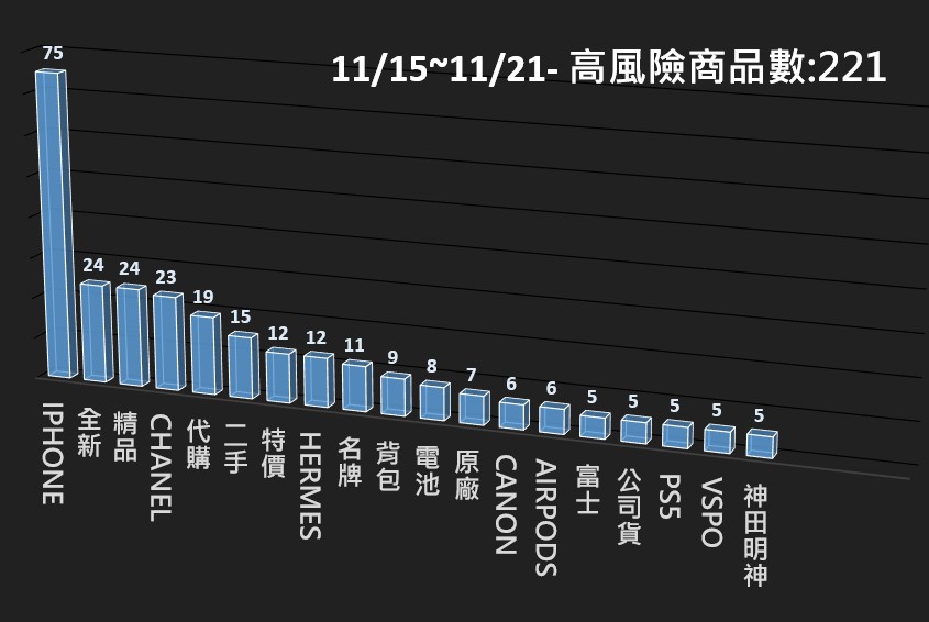 本署電商防詐雷達本週(11/15~11/21)共掃瞄19,657筆電商平台商品,發現其中221筆為高風險商品,並已提供相關資訊給電商平台進行預防性下架,以降低消費者接觸詐騙商品的風險。