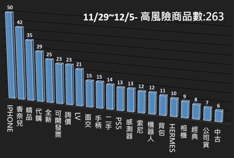 本署電商防詐雷達本週(11/29~12/5)共掃瞄20,746筆電商平台商品,發現其中263筆為高風險商品,並已提供相關資訊給電商平台進行預防性下架,以降低消費者接觸詐騙商品的風險。