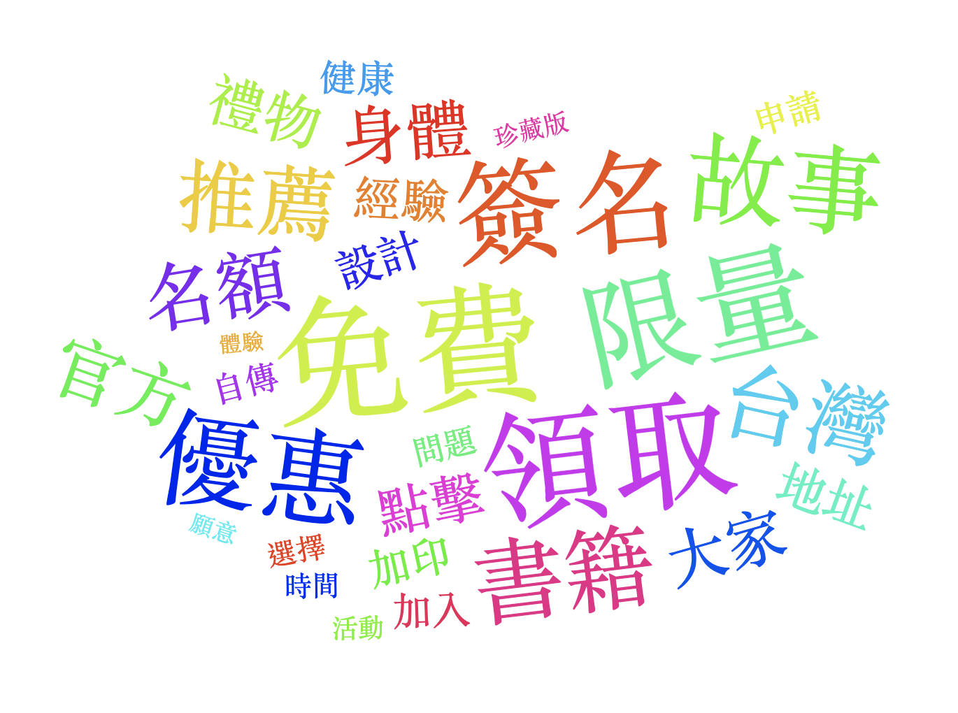 常見「免費早療檢測限 10 名」、「免費簽名書限量贈送」,限名額、免運費等話術。