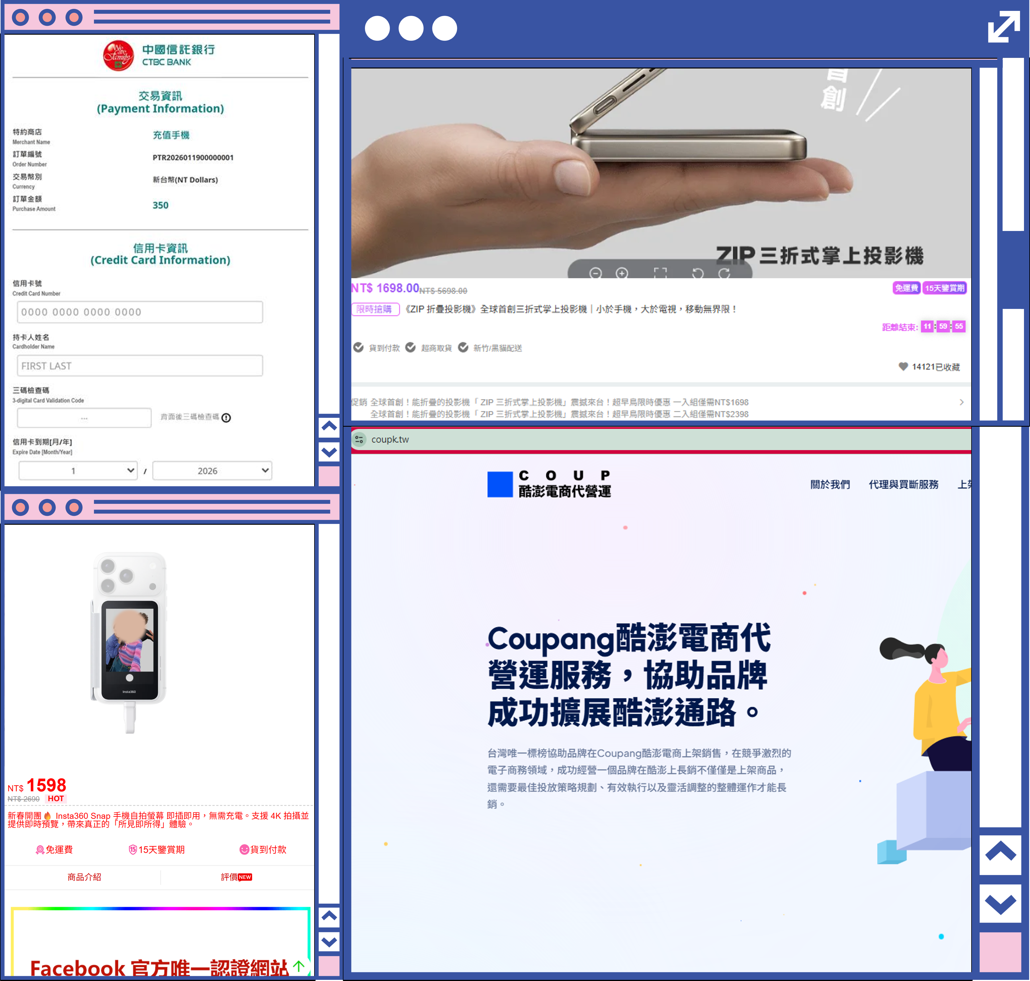 🛠️偽造銀行信用卡付款畫面竊取資料:部分詐騙流程會在結帳時跳轉至看似銀行官方的信用卡付款頁面,要求輸入卡號、驗證碼或 OTP。由於畫面高度仿真,容易讓人誤以為是正常交易流程,實際上資料一旦輸入,就可能直接落入不法分子手中。