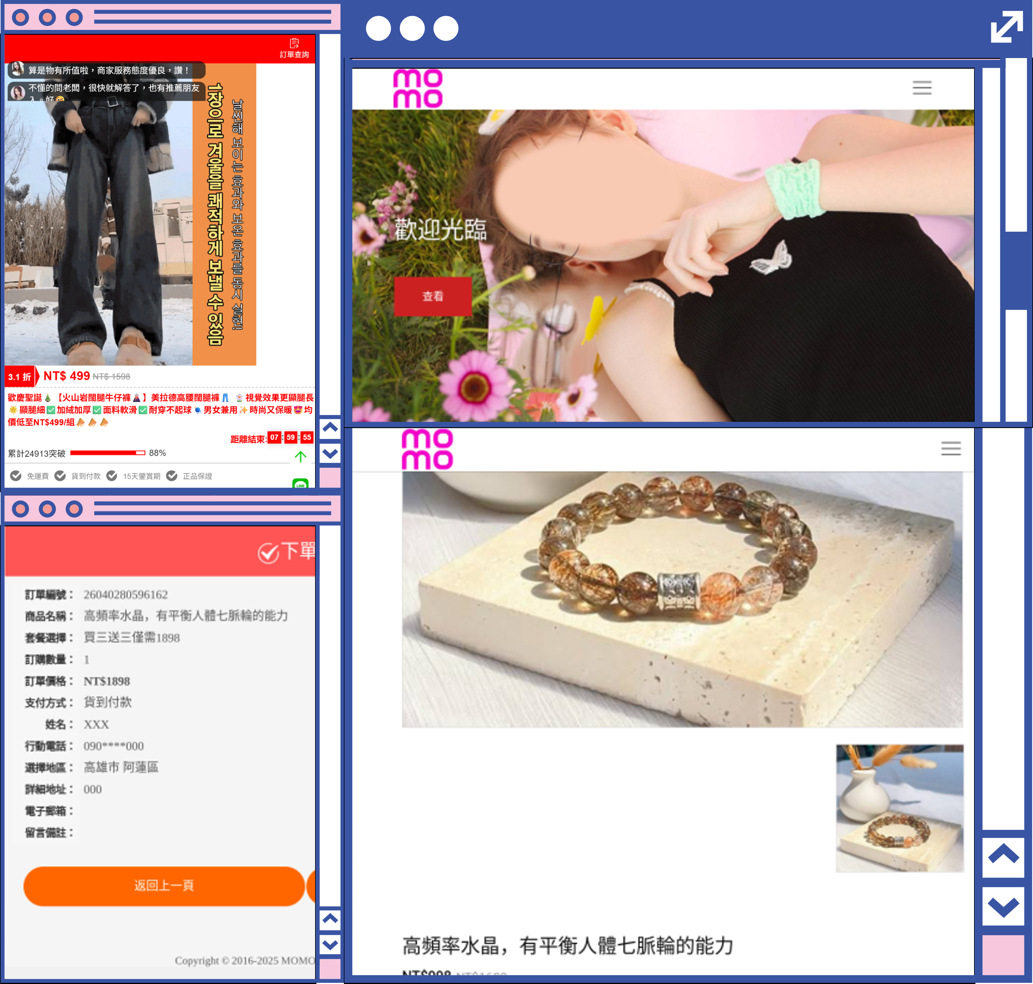 🛠️假冒知名電商頁面誘導交易:詐騙網站常仿冒大型電商平台的版面設計、活動頁或品牌視覺,讓頁面看起來與平常熟悉的購物網站相似,藉此降低民眾戒心。這類頁面多透過社群廣告、不明連結或限時優惠導流,實際與原平台無關,目的是誘導填寫個資或完成付款。