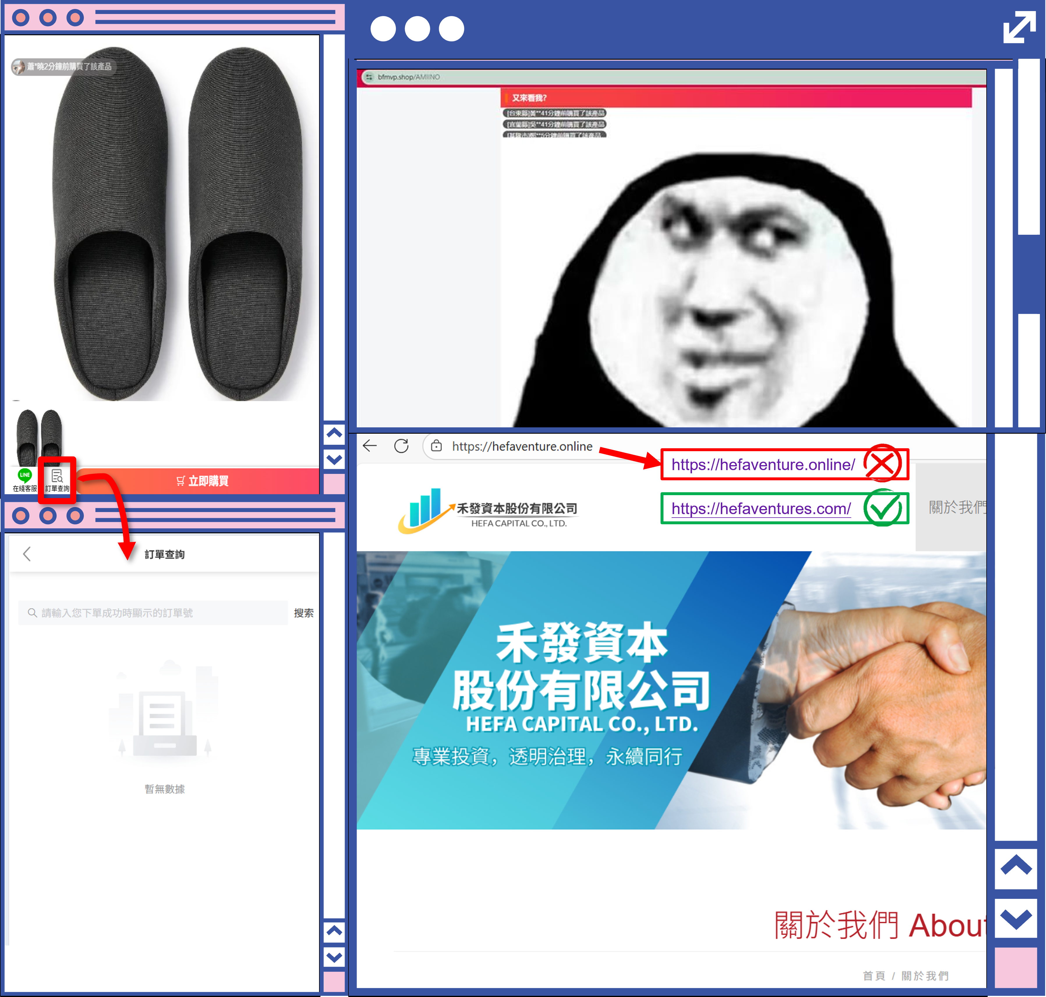 網購前多加查證,遠離三大常見詐騙手法:假冒官方頁面誘導輸入帳號、密碼或付款資訊、混用簡體字與中國用語混淆視聽的假購物平台、假借名人代言與冒用品牌販售仿冒品。#網購安全 #個資保護 #安全購物 #防詐騙
