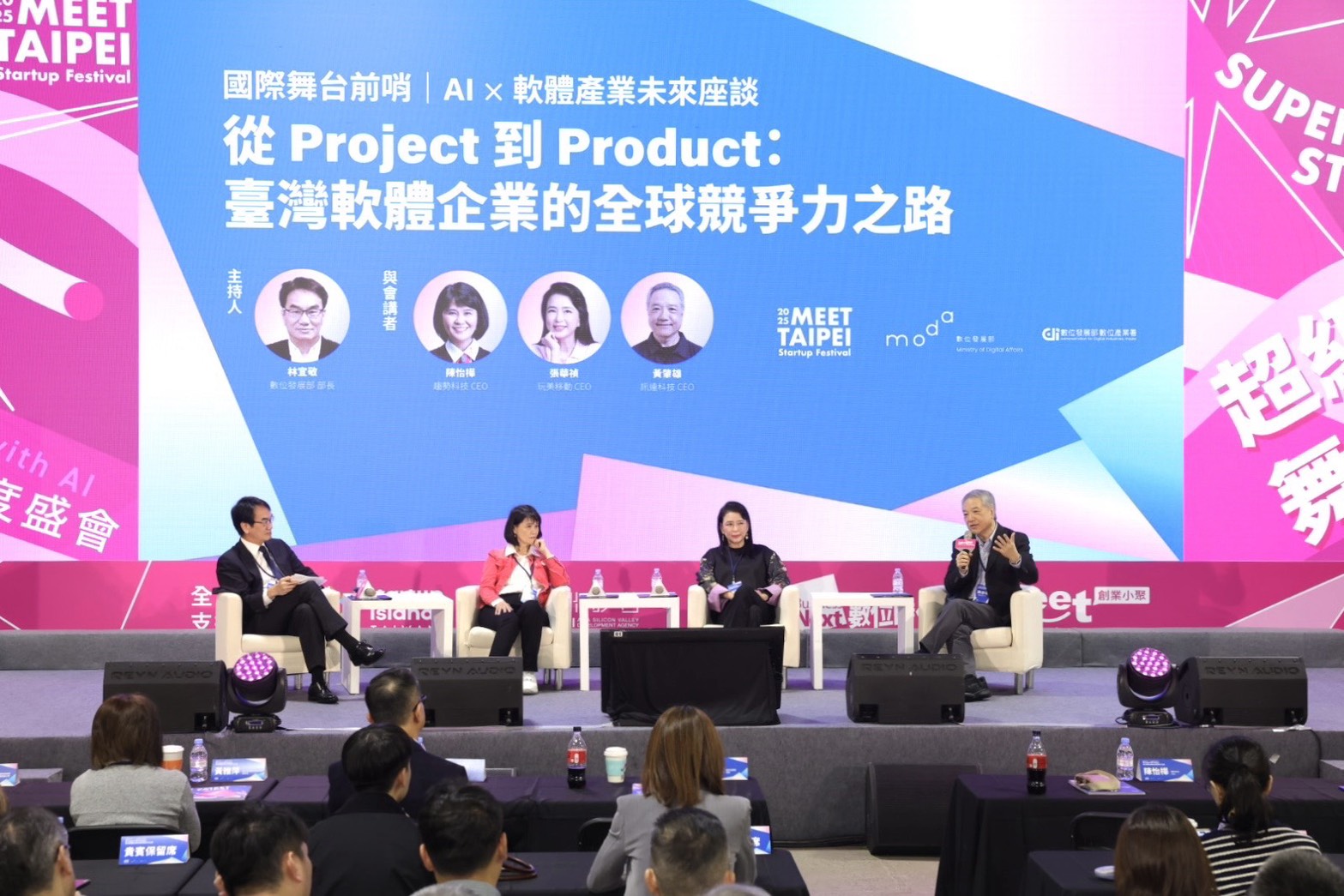 數位發展部今(22)日於「2025 Meet Taipei 創新創業嘉年華」舉辦「從Project到Product:臺灣軟體企業的全球競爭力之路」未來座談,由林宜敬部長親自主持,邀請趨勢科技CEO陳怡樺、玩美移動CEO張華禎及訊連科技CEO黃肇雄共同與談,深入探討臺灣軟體產業在AI 與雲端浪潮下的轉型契機。三位企業領袖從實務經驗出發,分享如何透過產品經營,打造具品牌價值與國際競爭力的新典範。今日現場有超過220位來自資訊服務、通訊傳播、網路服務、整合行銷、金融投顧及新創團隊等軟體產業相關人士踴躍參與,會後更進一步相互交流,共同激盪臺灣軟體產業發展的新火花。