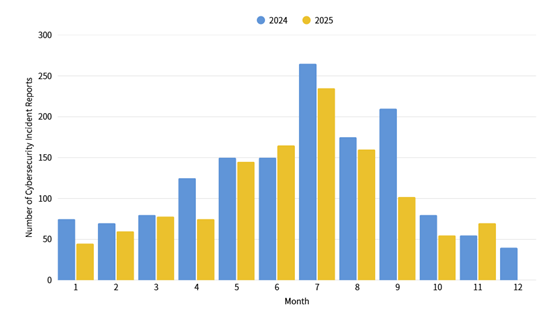 The number of cybersecurity incident reports totaled 72 this month, representing a 35.85% increase compared to the same period last year. The primary type of reported incidents were illegal intrusions, accounting for 58.40% of the total cases. Specific cases involved PUBLOAD malware infections introduced via portable media; furthermore, Network Video Recorder (NVR) were compromised and exploited to download Linux malware using Curl commands. Statistics for cybersecurity incident reports over the past year are shown in Figure 2.