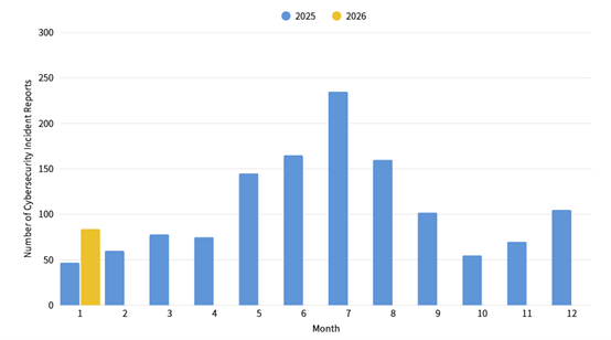 A total of 84 cybersecurity incident reports were received this month, representing 1.79 times the number reported during the same period last year. The primary category of incidents was illegal intrusion, accounting for 66.67% of the total reports. Notably, the most frequently reported incidents involved the installation of counterfeit software leading to malware infection, accounting for 16.67% of total reported cases. Statistics for cybersecurity incident reports over the past year are shown in Figure 2.