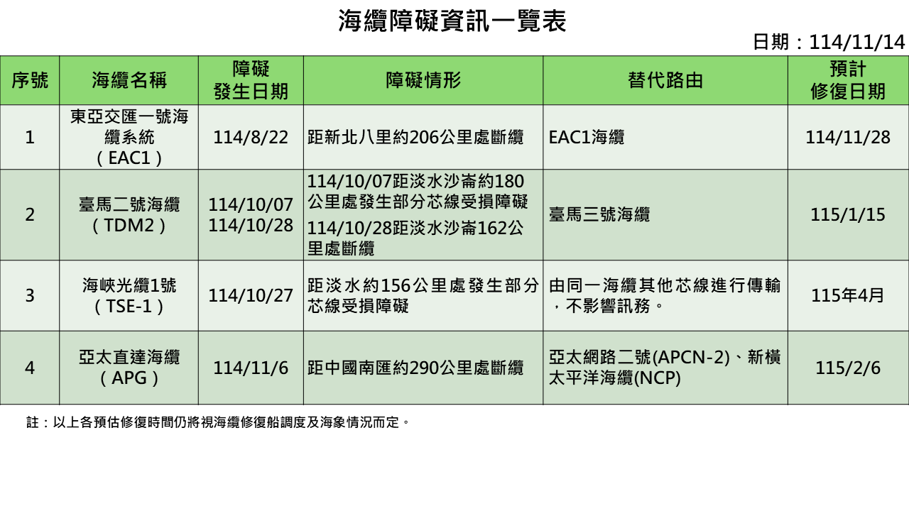 註:本網頁圖案來源 Submarine Cable Map https://www.submarinecablemap.com/country/taiwan