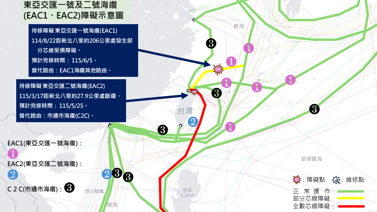 114/10/26 | 距淡水約160公里處發生部分芯線受損障礙 | 由同一海纜其他芯線進行傳輸,不影響訊務。 | 115/6/10 |