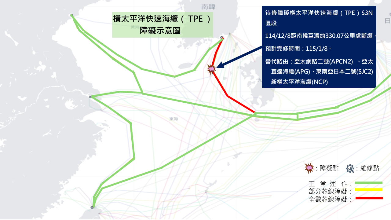 114/12/8 | 距南韓巨濟約330.07公里處斷纜 | APCN-2、APG、NCP、東南亞日本二號(SJC2) | 115/1/8 |