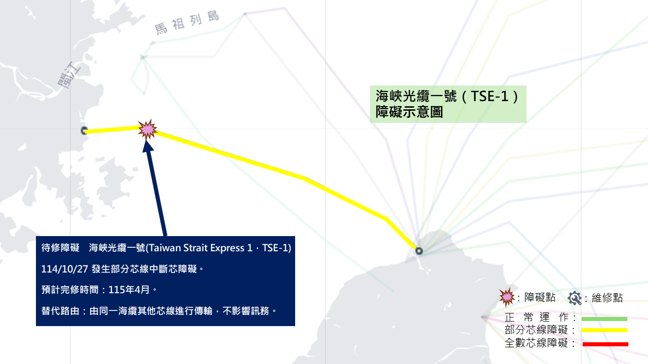 114/10/7 | 114/10/7距淡水沙崙約180公里處發生部分芯線受損障礙 | 臺馬三號海纜 | 115/1/15 |