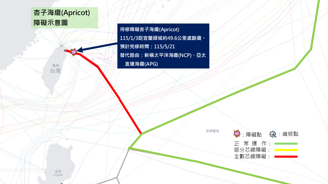 五、杏子海纜障礙示意圖 中華電信官方公告:杏子海纜 Apricot S6區段障礙說明