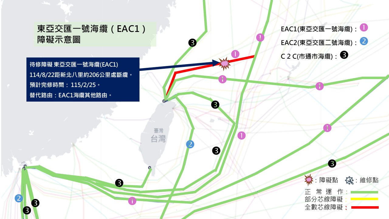 114/8/22 | 距新北八里約206公里處斷纜 | EAC1海纜 | 115/2/25 |