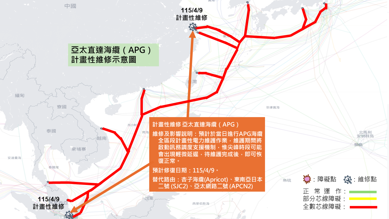 預計於當日進行APG海纜全區段計畫性電力維護作業,維護期間將啟動訊務調度支援機制,惟尖峰時段可能會出現輕微延遲,待維護完成後,即可恢復正常。 | 杏子海纜(Apricot)、東南亞日本二號 (SJC2)、亞太網路二號 (APCN2) |