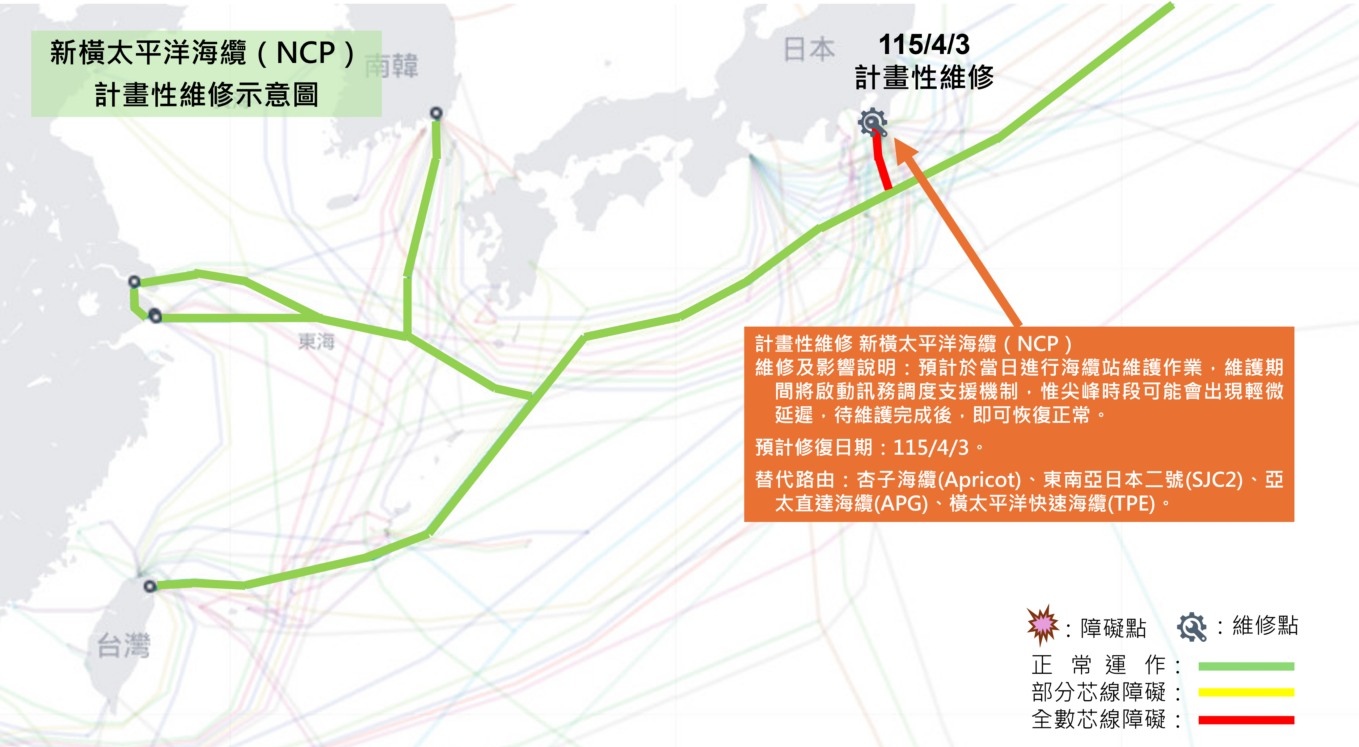 三、新橫太平洋海纜(NCP)計畫性維修示意圖 中華電信官方公告:新橫太平洋海纜(NCP)計畫性維護說明
