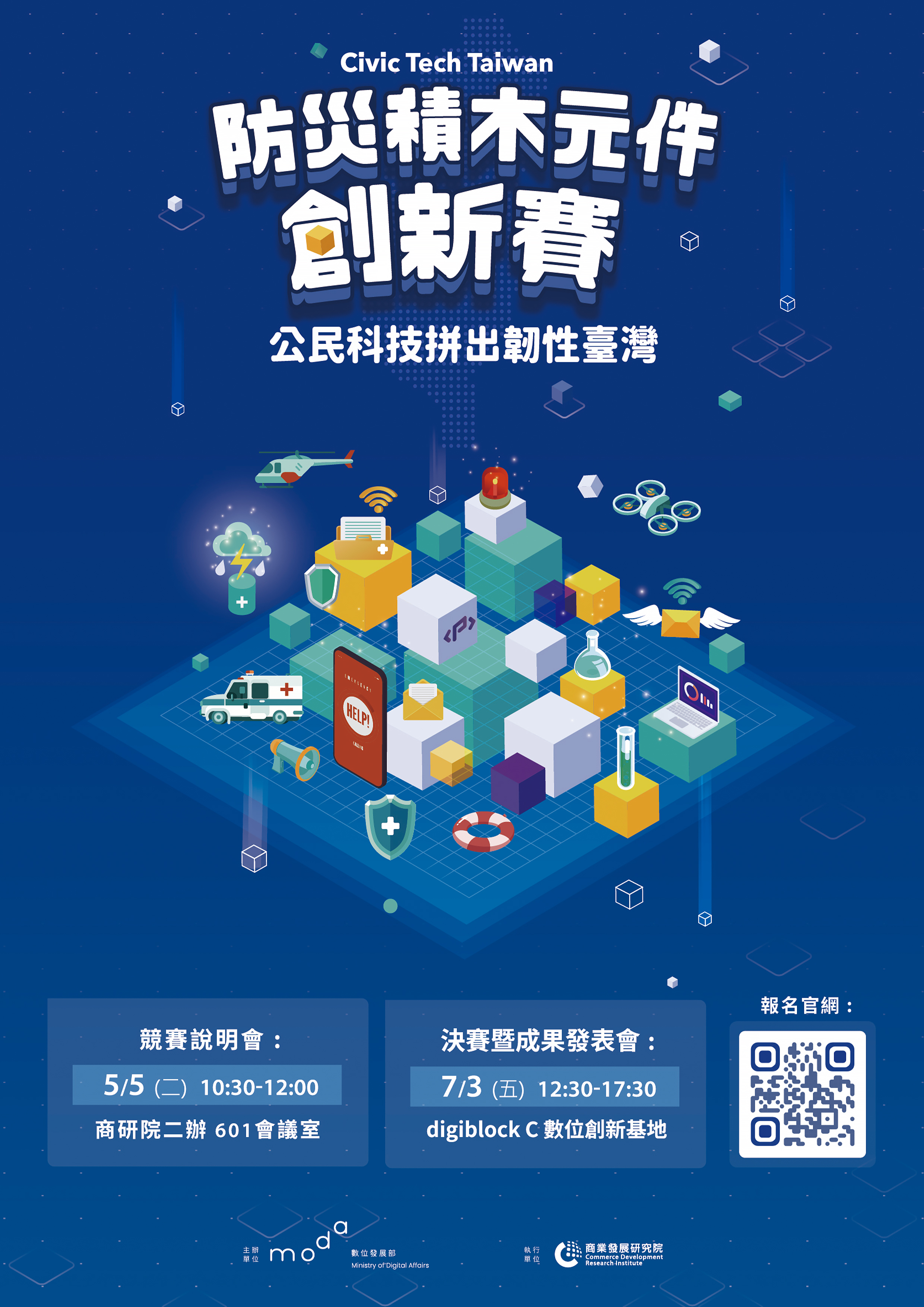 「防災積木元件創新賽」現正熱烈報名中,誠摯邀請具備數位應用能力的個人與團隊踴躍參與,共同堆疊臺灣的防災實力。詳情及報名資訊,請參閱競賽網頁:https://civictech.moda.gov.tw/